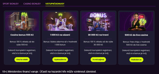 Hrajte zodpovědně a pro zábavu! Zákaz účasti osob mladších 18 let na hazardní hře. Ministerstvo financí varuje: Účastí na hazardní hře může vzniknout závislost! Využití bonusů je podmíněno registrací u provozovatele - informace zde.